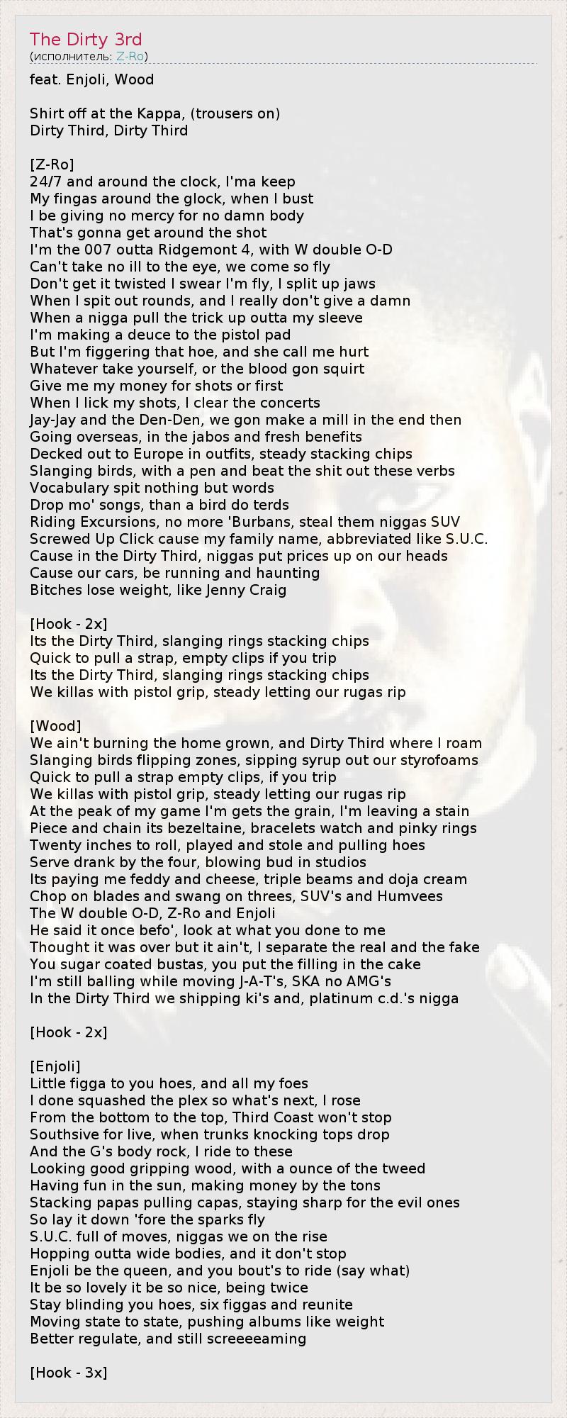 Это интересно:Joseph W. McVey, более известный под сценическим псевдонимом Z-Ro. Уроженец Хьюстона, начал свою карьеру в 1995 году.Имеет репутацию южного рэпера, однако звёздный статус не распространяется дальше Южных Штатов. Газета "New York Times" назвала его "Одним из самых недооценённых Американских рэперов".Альбом "I'm Still Livin' " был выпущен в 2006 году, в это время Z-Ro... продолжение