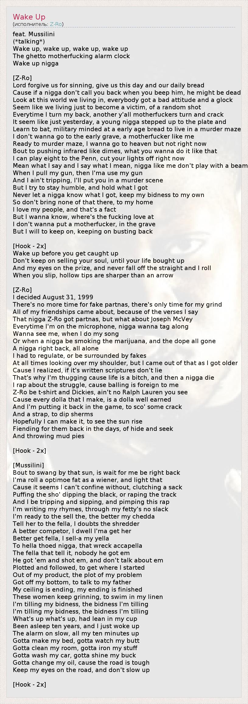 Это интересно:Joseph W. McVey, более известный под сценическим псевдонимом Z-Ro. Уроженец Хьюстона, начал свою карьеру в 1995 году.Имеет репутацию южного рэпера, однако звёздный статус не распространяется дальше Южных Штатов. Газета "New York Times" назвала его "Одним из самых недооценённых Американских рэперов".Альбом "I'm Still Livin' " был выпущен в 2006 году, в это время Z-Ro... продолжение