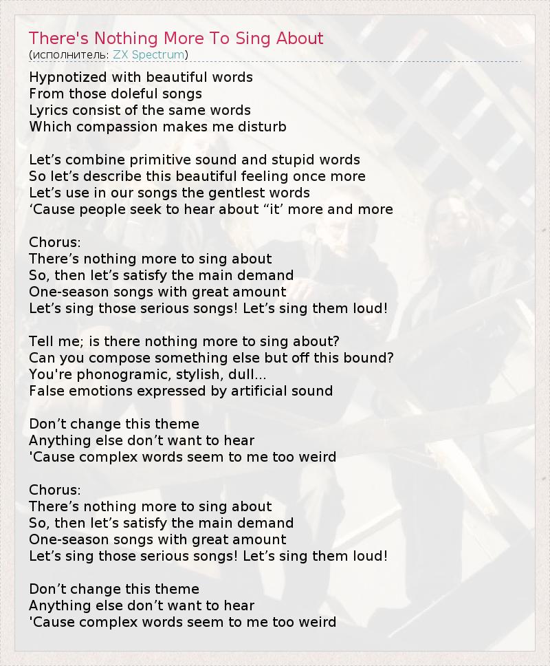 Hypnotized with beautiful words From those doleful songs Lyrics consist of the same words Which compassion makes me disturb Let’s combine primitive sound and stupid words So let’s describe this beautiful feeling once more Let’s use in our songs the gentlest words ‘Cause people seek to hear about “it’ more and more Chorus: There’s nothing more to sing about So, then let’s satisfy the main demand One-season songs with great amount Let’s sing those serious songs! Let’s sing them loud! Tell me; is there nothing more to sing about? Can you compose something else but off this bound? You're phonogramic, stylish, dull... False emotions expressed by artificial sound Don’t change this theme Anything else don’t want to hear 'Cause complex words seem to me too weird Chorus: There’s nothing more to sing about So, then let’s satisfy the main demand One-season songs with great amount Let’s sing those serious songs! Let’s sing them loud! Don’t change this theme Anything else don’t want to hear 'Cause complex words seem to me too weird