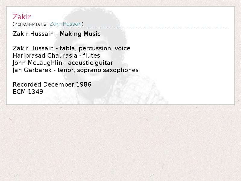 Это интересно:Его считают величайшим исполнителем на табла всех времен. Закир Хуссейн (Zakir Hussain), сын знаменитого мастера игры на табла Устада Алларакха (Ustad Allarakha), играл с огромным количеством самых разных артистов. Среди них классические индийские мастера - Рави Шанкар (Ravi Shankar), Шивкумар Шарма (Shivkumar Sharma), Лакшминараяна Шанкар (Lakshminarayana Shankar), Али Акбар Хан (Ali Akbar Khan) и другие. Затем - пионеры джаза -... продолжение