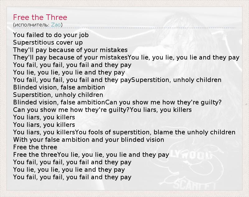 You failed to do your job Superstitious cover up They'll pay because of your mistakes They'll pay because of your mistakesYou lie, you lie, you lie and they pay You fail, you fail, you fail and they pay You lie, you lie, you lie and they pay You fail, you fail, you fail and they paySuperstition, unholy children Blinded vision, false ambition Superstition, unholy children Blinded vision, false ambitionCan you show me how they're guilty? Can you show me how they're guilty?You liars, you killers You liars, you killers You liars, you killers You liars, you killersYou fools of superstition, blame the unholy children With your false ambition and your blinded vision Free the three Free the threeYou lie, you lie, you lie and they pay You fail, you fail, you fail and they pay You lie, you lie, you lie and they pay You fail, you fail, you fail and they pay