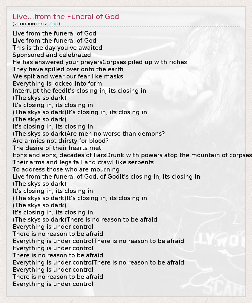 Live from the funeral of God Live from the funeral of God This is the day you've awaited Sponsored and celebrated He has answered your prayersCorpses piled up with riches They have spilled over onto the earth We spit and wear our fear like masks Everything is locked into form Interrupt the feedIt's closing in, its closing in (The skys so dark) It's closing in, its closing in (The skys so dark)It's closing in, its closing in (The skys so dark) It's closing in, its closing in (The skys so dark)Are men no worse than demons? Are armies not thirsty for blood? The desire of their hearts met Eons and eons, decades of liarsDrunk with powers atop the mountain of corpses Their arms and legs fail and crawl like serpents To address those who are mourning Live from the funeral of God, of GodIt's closing in, its closing in (The skys so dark) It's closing in, its closing in (The skys so dark)It's closing in, its closing in (The skys so dark) It's closing in, its closing in (The skys so dark)There is no reason to be afraid Everything is under control There is no reason to be afraid Everything is under controlThere is no reason to be afraid Everything is under control There is no reason to be afraid Everything is under controlThere is no reason to be afraid Everything is under control There is no reason to be afraid Everything is under control