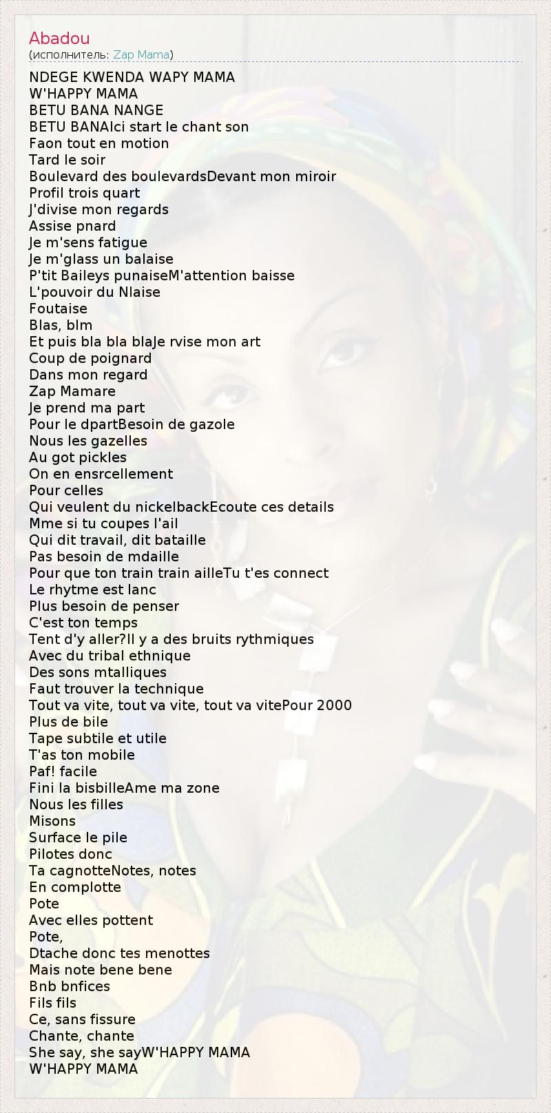 NDEGE KWENDA WAPY MAMA W'HAPPY MAMA BETU BANA NANGE BETU BANAIci start le chant son Faon tout en motion Tard le soir Boulevard des boulevardsDevant mon miroir Profil trois quart J'divise mon regards Assise pnard Je m'sens fatigue Je m'glass un balaise P'tit Baileys punaiseM'attention baisse L'pouvoir du Nlaise Foutaise Blas, blm Et puis bla bla blaJe rvise mon art Coup de poignard Dans mon regard Zap Mamare Je prend ma part Pour le dpartBesoin de gazole Nous les gazelles Au got pickles On en ensrcellement Pour celles Qui veulent du nickelbackEcoute ces details Mme si tu coupes l'ail Qui dit travail, dit bataille Pas besoin de mdaille Pour que ton train train ailleTu t'es connect Le rhytme est lanc Plus besoin de penser C'est ton temps Tent d'y aller?Il y a des bruits rythmiques Avec du tribal ethnique Des sons mtalliques Faut trouver la technique Tout va vite, tout va vite, tout va vitePour 2000 Plus de bile Tape subtile et utile T'as ton mobile Paf! facile Fini la bisbilleAme ma zone Nous les filles Misons Surface le pile Pilotes donc Ta cagnotteNotes, notes En complotte Pote Avec elles pottent Pote, Dtache donc tes menottes Mais note bene bene Bnb bnfices Fils fils Ce, sans fissure Chante, chante She say, she sayW'HAPPY MAMA W'HAPPY MAMA