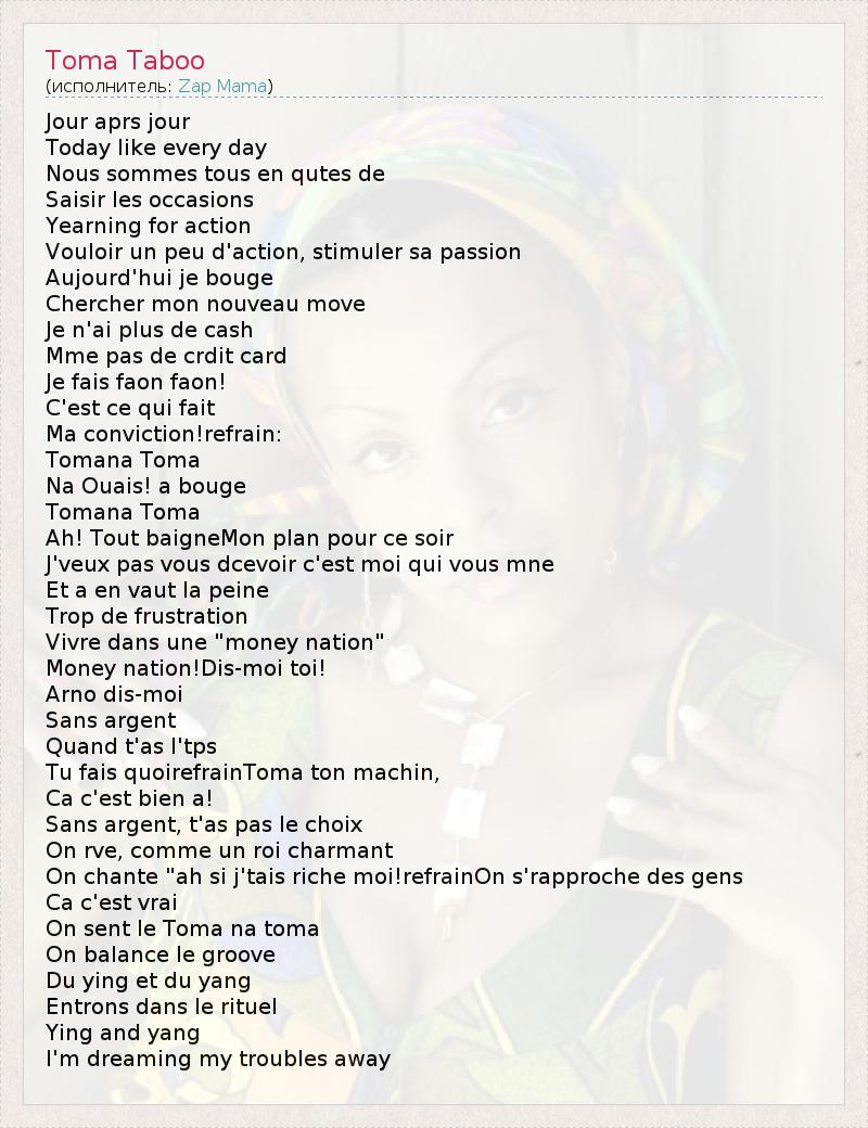 А как ты думаешь, о чем песня "Toma Taboo" ?