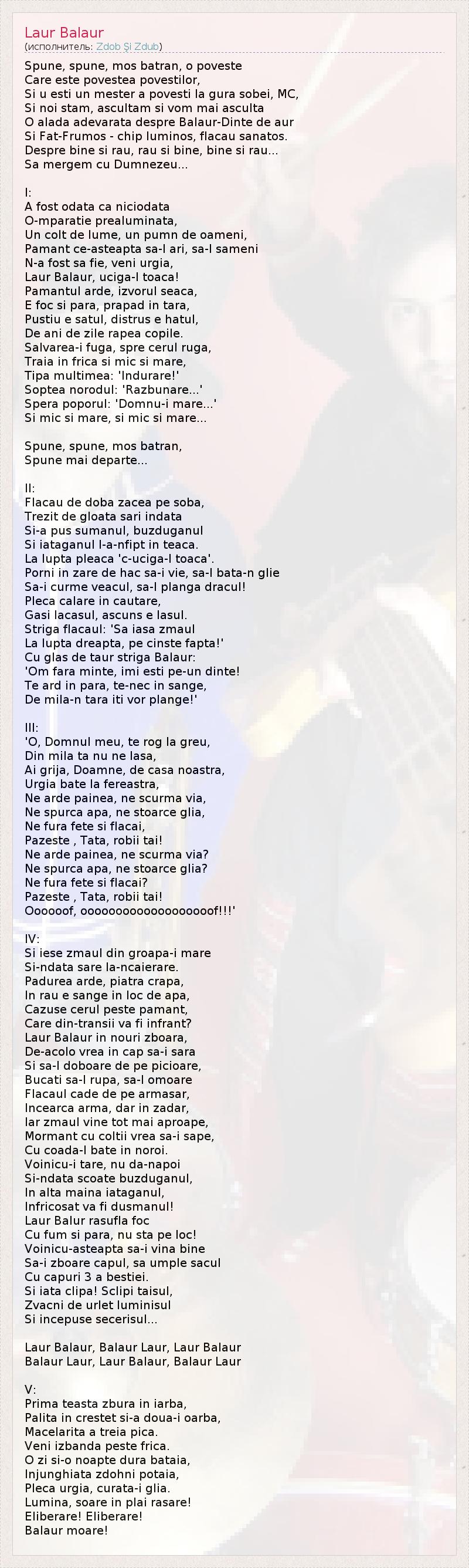 Spune, spune, mos batran, o poveste Care este povestea povestilor, Si u esti un mester a povesti la gura sobei, MC, Si noi stam, ascultam si vom mai asculta O alada adevarata despre Balaur-Dinte de aur Si Fat-Frumos - chip luminos, flacau sanatos. Despre bine si rau, rau si bine, bine si rau... Sa mergem cu Dumnezeu... I: A fost odata ca niciodata O-mparatie prealuminata, Un colt de lume, un pumn de oameni, Pamant ce-asteapta sa-l ari, sa-l sameni N-a fost sa fie, veni urgia, Laur Balaur, uciga-l toaca! Pamantul arde, izvorul seaca, E foc si para, prapad in tara, Pustiu e satul, distrus e hatul, De ani de zile rapea copile. Salvarea-i fuga, spre cerul ruga, Traia in frica si mic si mare, Tipa multimea: 'Indurare!' Soptea norodul: 'Razbunare...' Spera poporul: 'Domnu-i mare...' Si mic si mare, si mic si mare... Spune, spune, mos batran, Spune mai departe... II: Flacau de doba zacea pe soba, Trezit de gloata sari indata Si-a pus sumanul, buzduganul Si iataganul l-a-nfipt in teaca. La lupta pleaca 'c-uciga-l toaca'. Porni in zare de hac sa-i vie, sa-l bata-n glie Sa-i curme veacul, sa-l planga dracul! Pleca calare in cautare, Gasi lacasul, ascuns e lasul. Striga flacaul: 'Sa iasa zmaul La lupta dreapta, pe cinste fapta!' Cu glas de taur striga Balaur: 'Om fara minte, imi esti pe-un dinte! Te ard in para, te-nec in sange, De mila-n tara iti vor plange!' III: 'O, Domnul meu, te rog la greu, Din mila ta nu ne lasa, Ai grija, Doamne, de casa noastra, Urgia bate la fereastra, Ne arde painea, ne scurma via, Ne spurca apa, ne stoarce glia, Ne fura fete si flacai, Pazeste , Tata, robii tai! Ne arde painea, ne scurma via? Ne spurca apa, ne stoarce glia? Ne fura fete si flacai? Pazeste , Tata, robii tai! Oooooof, ooooooooooooooooooof!!!' IV: Si iese zmaul din groapa-i mare Si-ndata sare la-ncaierare. Padurea arde, piatra crapa, In rau e sange in loc de apa, Cazuse cerul peste pamant, Care din-transii va fi infrant? Laur Balaur in nouri zboara, De-acolo vrea in cap sa-i sara Si sa-l doboare de pe picioare, Bucati sa-l rupa, sa-l omoare Flacaul cade de pe armasar, Incearca arma, dar in zadar, Iar zmaul vine tot mai aproape, Mormant cu coltii vrea sa-i sape, Cu coada-l bate in noroi. Voinicu-i tare, nu da-napoi Si-ndata scoate buzduganul, In alta maina iataganul, Infricosat va fi dusmanul! Laur Balur rasufla foc Cu fum si para, nu sta pe loc! Voinicu-asteapta sa-i vina bine Sa-i zboare capul, sa umple sacul Cu capuri 3 a bestiei. Si iata clipa! Sclipi taisul, Zvacni de urlet luminisul Si incepuse secerisul... Laur Balaur, Balaur Laur, Laur Balaur Balaur Laur, Laur Balaur, Balaur Laur V: Prima teasta zbura in iarba, Palita in crestet si-a doua-i oarba, Macelarita a treia pica. Veni izbanda peste frica. O zi si-o noapte dura bataia, Injunghiata zdohni potaia, Pleca urgia, curata-i glia. Lumina, soare in plai rasare! Eliberare! Eliberare! Balaur moare!