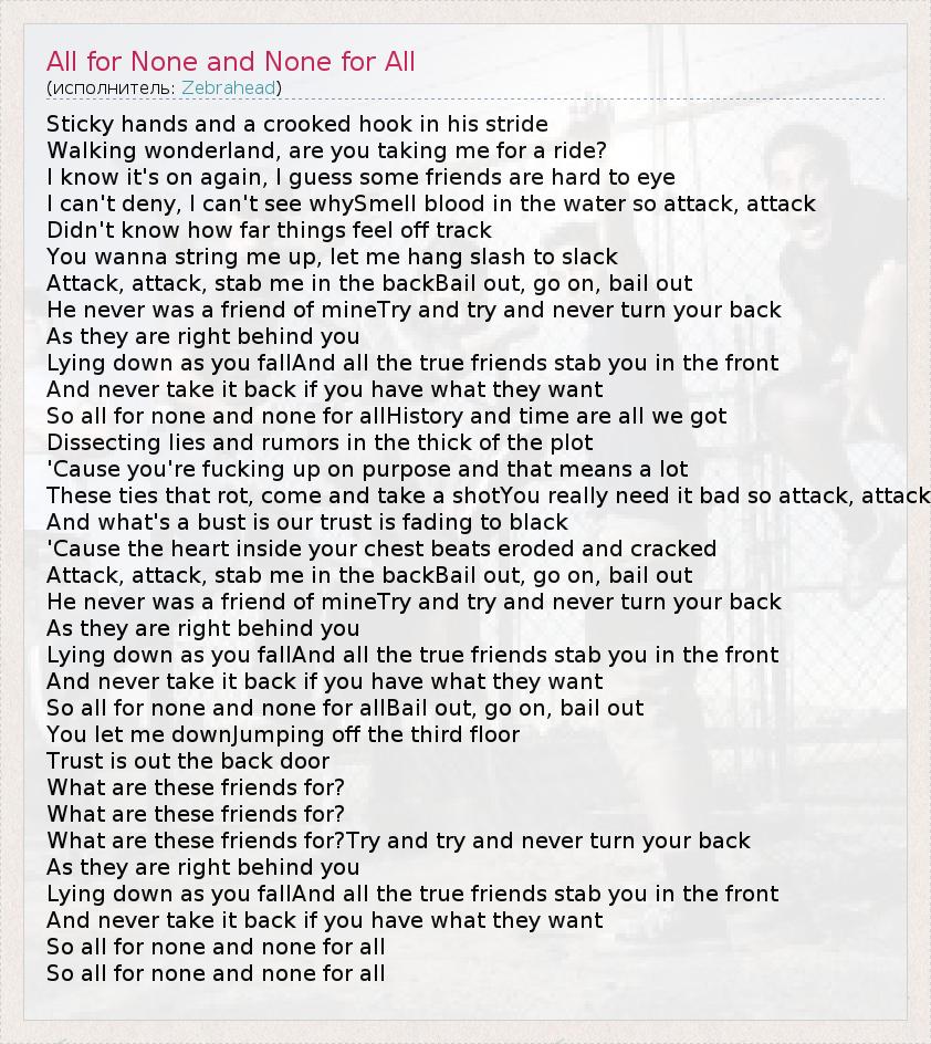 А как ты думаешь, о чем песня "All for None and None for All" ?