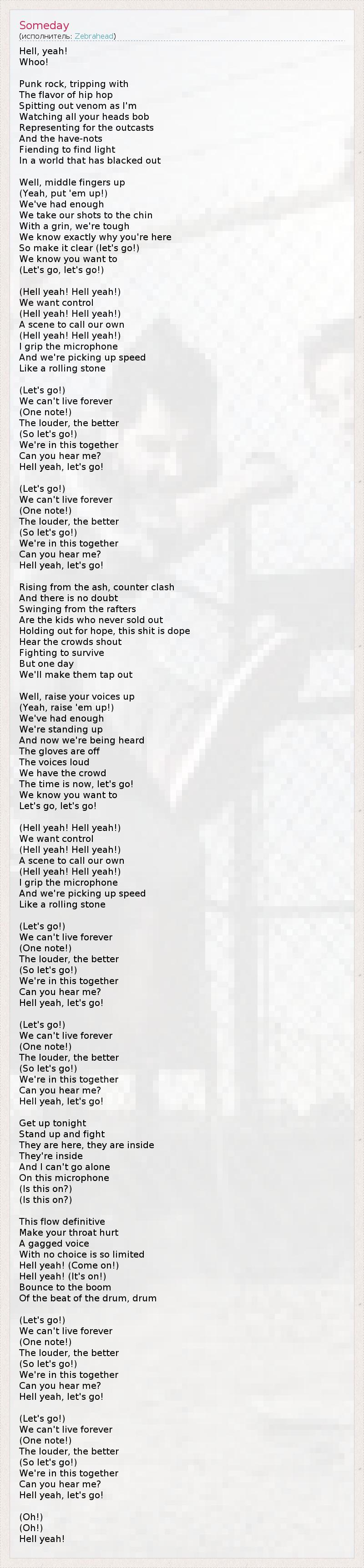 Это интересно:Группа Zebrahead из Оранж Каунти, штат Калифорния - американская панк рок группа, образованная в городке Ла Хабра (La Habra), штат Калифорния.Организована в 1996 году вокалистом/гитаристом Джастином Мауриэлло (Justin Mauriello, ранее игравшим в Once There), гитаристом Грегом Бергдорфом (Greg Bergdorf, ранее игравшим в группе 409), бас-гитаристом Беном Осмундсоном (Ben Osmundson, ранее игравшим в 3-Ply) и барабанщиком Эдом... продолжение