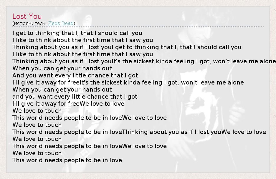 I get to thinking that I, that I should call you I like to think about the first time that I saw you Thinking about you as if I lost youI get to thinking that I, that I should call you I like to think about the first time that I saw you Thinking about you as if I lost youIt's the sickest kinda feeling I got, won't leave me alone When you can get your hands out And you want every little chance that I got I'll give it away for freeIt's the sickest kinda feeling I got, won't leave me alone When you can get your hands out and you want every little chance that I got I'll give it away for freeWe love to love We love to touch This world needs people to be in loveWe love to love We love to touch This world needs people to be in loveThinking about you as if I lost youWe love to love We love to touch This world needs people to be in loveWe love to love We love to touch This world needs people to be in love