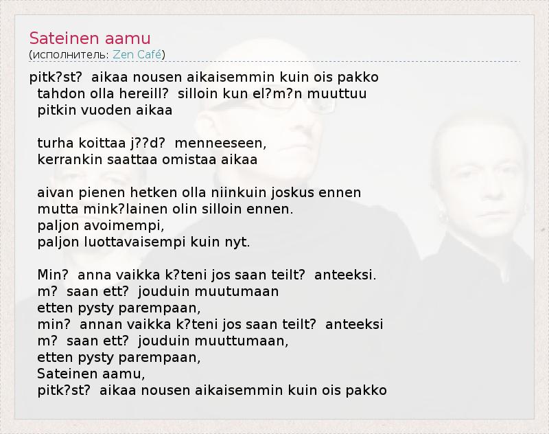 Это интересно:Финская рок-группа Zen Café, основанная в 1992 году в городе Турку, с конца 90-х годов завоевала широкую популярность в родной Финляндии, однако в других странах группа остается малоизвестной и по сей день. Со стороны звукозаписывающих лейблов не было попыток выпуска альбомов Zen Café на экспорт прежде всего по той причине, что группа исполняет свои песни исключительно на финском языке.Название... продолжение