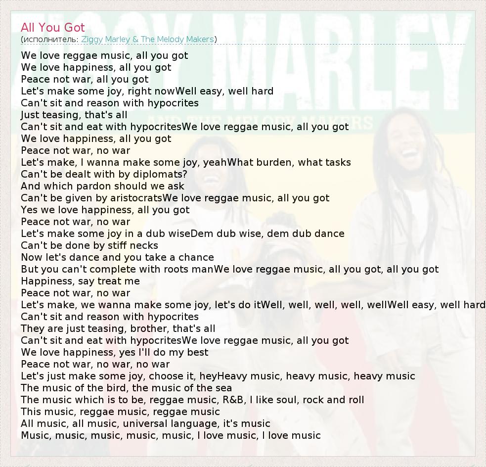 But you can't complete with roots manWe love reggae music, all you got, all you got