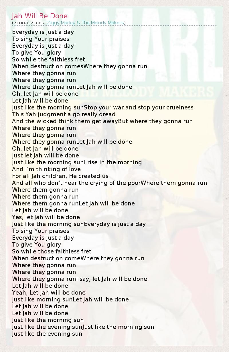 Everyday is just a day To sing Your praises Everyday is just a day To give You glory So while the faithless fret When destruction comesWhere they gonna run Where they gonna run Where they gonna run Where they gonna runLet Jah will be done Oh, let Jah will be done Let Jah will be done Just like the morning sunStop your war and stop your cruelness This Yah judgment a go really dread And the wicked think them get awayBut where they gonna run Where they gonna run Where they gonna run Where they gonna runLet Jah will be done Oh, let Jah will be done Just let Jah will be done Just like the morning sunI rise in the morning And I'm thinking of love For all Jah children, He created us And all who don't hear the crying of the poorWhere them gonna run Where them gonna run Where them gonna run Where them gonna runLet Jah will be done Let Jah will be done Yes, let Jah will be done Just like the morning sunEveryday is just a day To sing Your praises Everyday is just a day To give You glory So while those faithless fret When destruction comeWhere they gonna run Where they gonna run Where they gonna run Where they gonna runI say, let Jah will be done Let Jah will be done Yeah, Let Jah will be done Just like morning sunLet Jah will be done Let Jah will be done Let Jah will be done Just like the morning sun Just like the evening sunJust like the morning sun Just like the evening sun