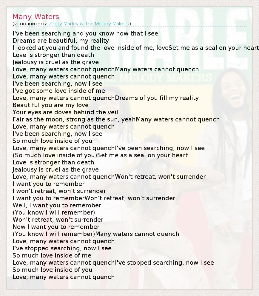 I've been searching and you know now that I see Dreams are beautiful, my reality I looked at you and found the love inside of me, loveSet me as a seal on your heart Love is stronger than death Jealousy is cruel as the grave Love, many waters cannot quenchMany waters cannot quench Love, many waters cannot quench I've been searching, now I see I've got some love inside of me Love, many waters cannot quenchDreams of you fill my reality Beautiful you are my love Your eyes are doves behind the veil Fair as the moon, strong as the sun, yeahMany waters cannot quench Love, many waters cannot quench I've been searching, now I see So much love inside of you Love, many waters cannot quenchI've been searching, now I see (So much love inside of you)Set me as a seal on your heart Love is stronger than death Jealousy is cruel as the grave Love, many waters cannot quenchWon't retreat, won't surrender I want you to remember I won't retreat, won't surrender I want you to rememberWon't retreat, won't surrender Well, I want you to remember (You know I will remember) Won't retreat, won't surrender Now I want you to remember (You know I will remember)Many waters cannot quench Love, many waters cannot quench I've stopped searching, now I see So much love inside of me Love, many waters cannot quenchI've stopped searching, now I see So much love inside of you Love, many waters cannot quench