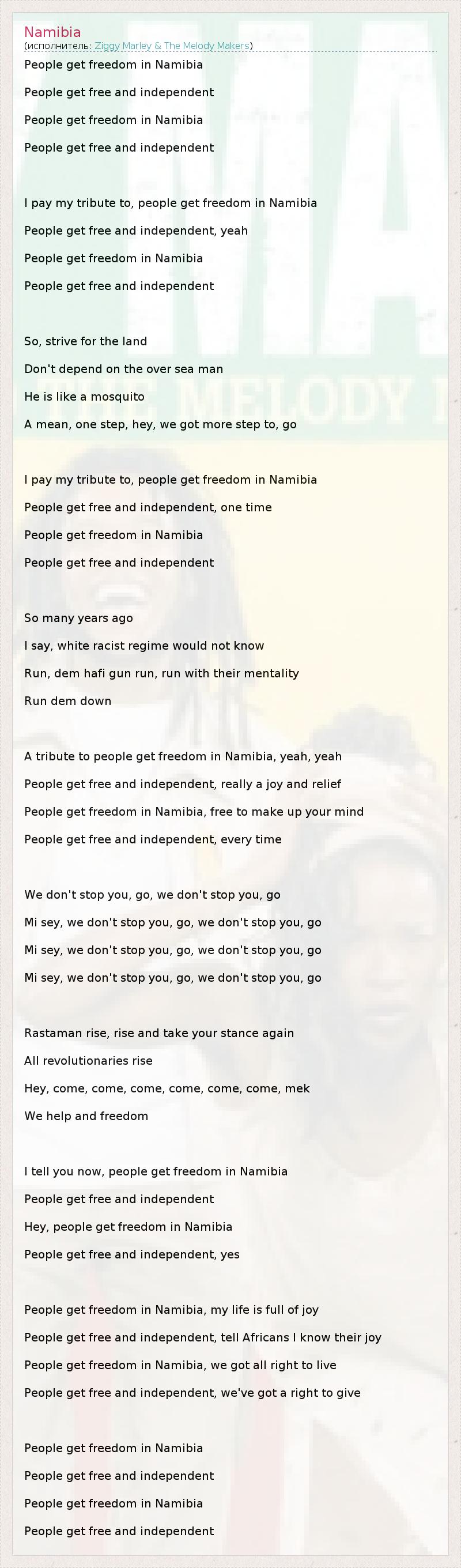 People get freedom in Namibia People get free and independent People get freedom in Namibia People get free and independent I pay my tribute to, people get freedom in Namibia People get free and independent, yeah People get freedom in Namibia People get free and independent So, strive for the land Don't depend on the over sea man He is like a mosquito A mean, one step, hey, we got more step to, go I pay my tribute to, people get freedom in Namibia People get free and independent, one time People get freedom in Namibia People get free and independent So many years ago I say, white racist regime would not know Run, dem hafi gun run, run with their mentality Run dem down A tribute to people get freedom in Namibia, yeah, yeah People get free and independent, really a joy and relief People get freedom in Namibia, free to make up your mind People get free and independent, every time We don't stop you, go, we don't stop you, go Mi sey, we don't stop you, go, we don't stop you, go Mi sey, we don't stop you, go, we don't stop you, go Mi sey, we don't stop you, go, we don't stop you, go Rastaman rise, rise and take your stance again All revolutionaries rise Hey, come, come, come, come, come, come, mek We help and freedom I tell you now, people get freedom in Namibia People get free and independent Hey, people get freedom in Namibia People get free and independent, yes People get freedom in Namibia, my life is full of joy People get free and independent, tell Africans I know their joy People get freedom in Namibia, we got all right to live People get free and independent, we've got a right to give People get freedom in Namibia People get free and independent People get freedom in Namibia People get free and independent