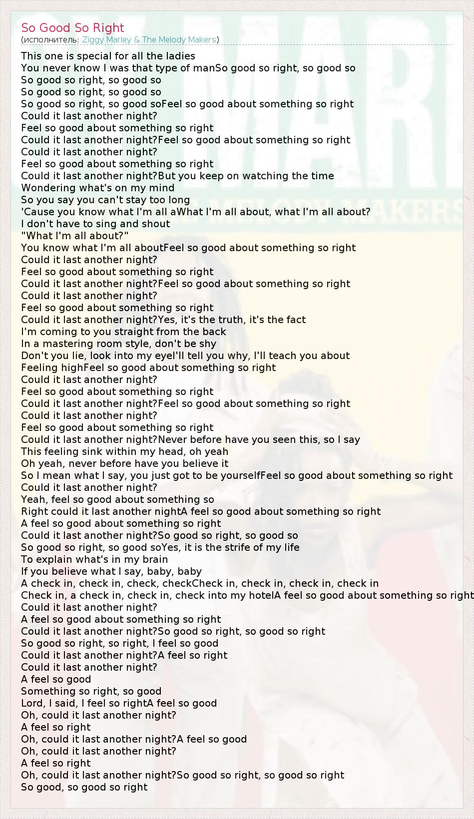 Это интересно:Ziggy Marley and the Melody Makers was a Jamaican Reggae family group whose line-up comprised lead singer Ziggy Marley alongside Sharon Marley, Cedella Marley, and Stephen Marley. Formed in 1979 in Brooklyn, New York, Ziggy Marley and the Melody Makers members began their musical endeavors in their pre-teens under the name The Melody Makers.Ziggy Marley and the Melody Makers was launched into mainstream recognition following the released of their best-selling fourth album, Conscious Party, which contained the hit single "Tomorrow People" and the number-one single "Tumblin' Down". Their fifth album, One Bright Day, which contains themes optimism and self-empowerment... продолжение