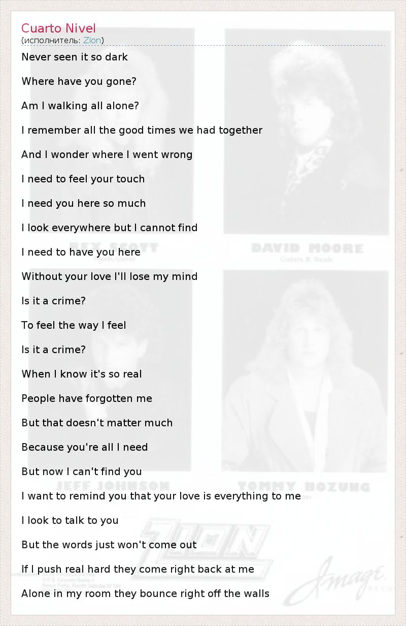 Never seen it so dark Where have you gone? Am I walking all alone? I remember all the good times we had together And I wonder where I went wrong I need to feel your touch I need you here so much I look everywhere but I cannot find I need to have you here Without your love I'll lose my mind Is it a crime? To feel the way I feel Is it a crime? When I know it's so real People have forgotten me But that doesn't matter much Because you're all I need But now I can't find you I want to remind you that your love is everything to me I look to talk to you But the words just won't come out If I push real hard they come right back at me Alone in my room they bounce right off the walls