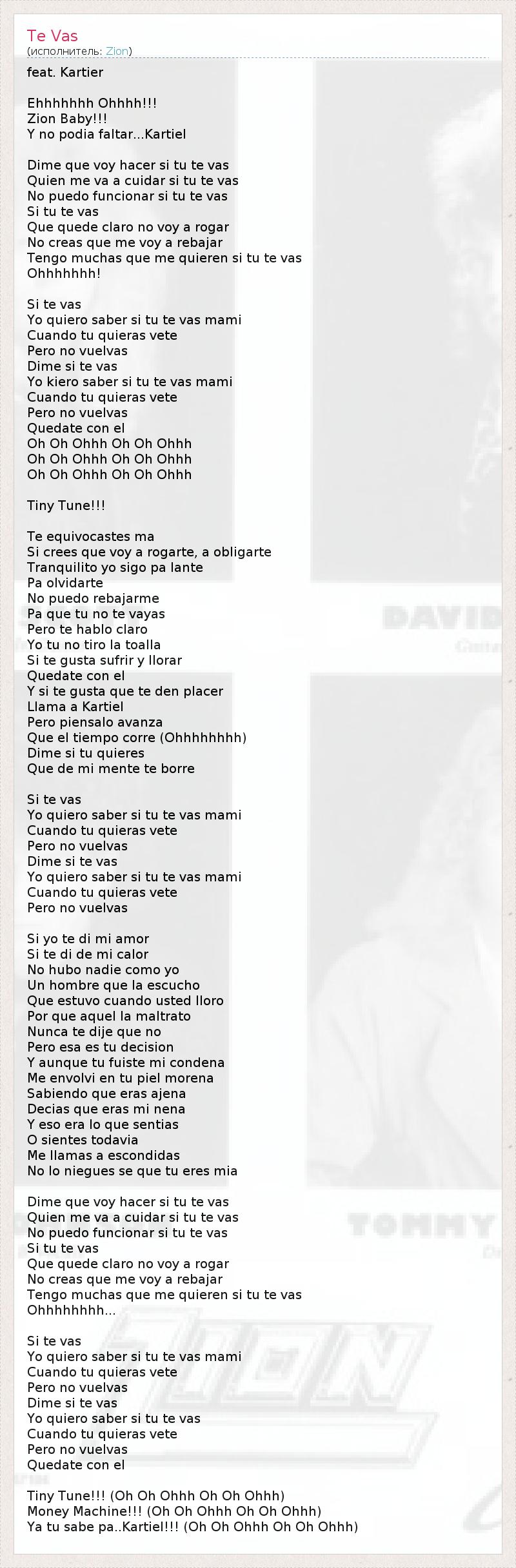 feat. Kartier Ehhhhhhh Ohhhh!!! Zion Baby!!! Y no podia faltar...Kartiel Dime que voy hacer si tu te vas Quien me va a cuidar si tu te vas No puedo funcionar si tu te vas Si tu te vas Que quede claro no voy a rogar No creas que me voy a rebajar Tengo muchas que me quieren si tu te vas Ohhhhhhh! Si te vas Yo quiero saber si tu te vas mami Cuando tu quieras vete Pero no vuelvas Dime si te vas Yo kiero saber si tu te vas mami Cuando tu quieras vete Pero no vuelvas Quedate con el Oh Oh Ohhh Oh Oh Ohhh Oh Oh Ohhh Oh Oh Ohhh Oh Oh Ohhh Oh Oh Ohhh Tiny Tune!!! Te equivocastes ma Si crees que voy a rogarte, a obligarte Tranquilito yo sigo pa lante Pa olvidarte No puedo rebajarme Pa que tu no te vayas Pero te hablo claro Yo tu no tiro la toalla Si te gusta sufrir y llorar Quedate con el Y si te gusta que te den placer Llama a Kartiel Pero piensalo avanza Que el tiempo corre (Ohhhhhhhh) Dime si tu quieres Que de mi mente te borre Si te vas Yo quiero saber si tu te vas mami Cuando tu quieras vete Pero no vuelvas Dime si te vas Yo quiero saber si tu te vas mami Cuando tu quieras vete Pero no vuelvas Si yo te di mi amor Si te di de mi calor No hubo nadie como yo Un hombre que la escucho Que estuvo cuando usted lloro Por que aquel la maltrato Nunca te dije que no Pero esa es tu decision Y aunque tu fuiste mi condena Me envolvi en tu piel morena Sabiendo que eras ajena Decias que eras mi nena Y eso era lo que sentias O sientes todavia Me llamas a escondidas No lo niegues se que tu eres mia Dime que voy hacer si tu te vas Quien me va a cuidar si tu te vas No puedo funcionar si tu te vas Si tu te vas Que quede claro no voy a rogar No creas que me voy a rebajar Tengo muchas que me quieren si tu te vas Ohhhhhhhh... Si te vas Yo quiero saber si tu te vas mami Cuando tu quieras vete Pero no vuelvas Dime si te vas Yo quiero saber si tu te vas Cuando tu quieras vete Pero no vuelvas Quedate con el Tiny Tune!!! (Oh Oh Ohhh Oh Oh Ohhh) Money Machine!!! (Oh Oh Ohhh Oh Oh Ohhh) Ya tu sabe pa..Kartiel!!! (Oh Oh Ohhh Oh Oh Ohhh)