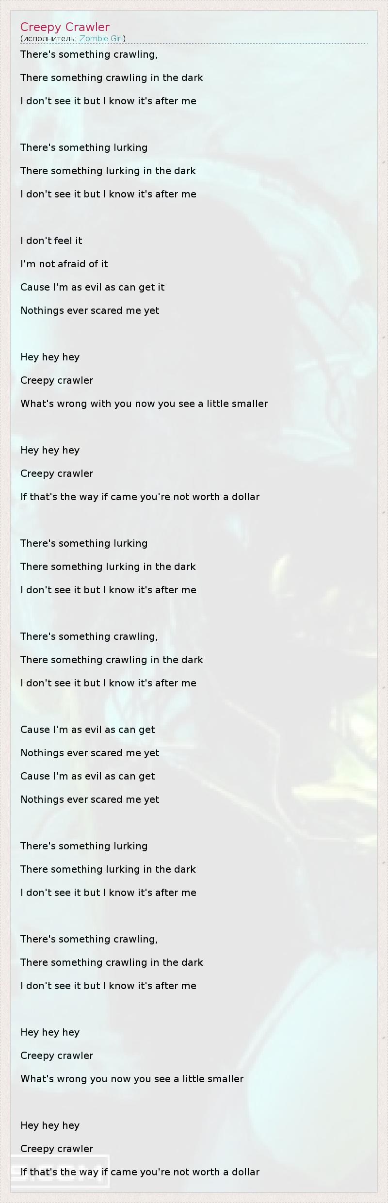 There's something crawling, There something crawling in the dark I don't see it but I know it's after me There's something lurking There something lurking in the dark I don't see it but I know it's after me I don't feel it I'm not afraid of it Cause I'm as evil as can get it Nothings ever scared me yet Hey hey hey Creepy crawler What's wrong with you now you see a little smaller Hey hey hey Creepy crawler If that's the way if came you're not worth a dollar There's something lurking There something lurking in the dark I don't see it but I know it's after me There's something crawling, There something crawling in the dark I don't see it but I know it's after me Cause I'm as evil as can get Nothings ever scared me yet Cause I'm as evil as can get Nothings ever scared me yet There's something lurking There something lurking in the dark I don't see it but I know it's after me There's something crawling, There something crawling in the dark I don't see it but I know it's after me Hey hey hey Creepy crawler What's wrong you now you see a little smaller Hey hey hey Creepy crawler If that's the way if came you're not worth a dollar
