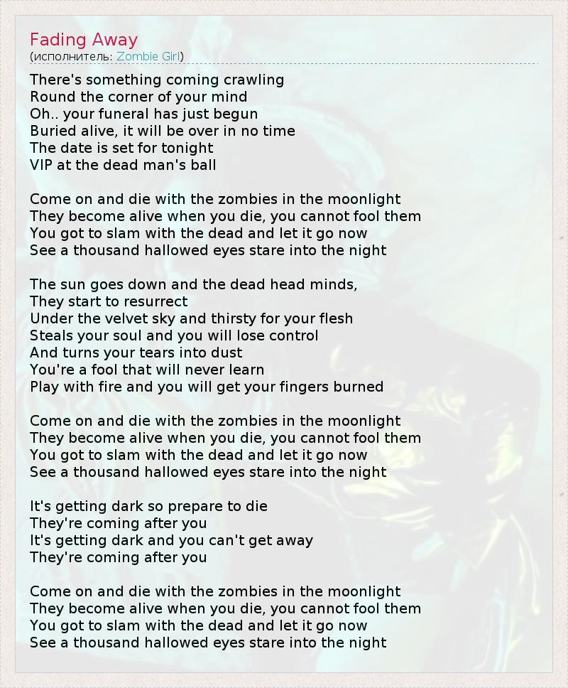 Это интересно:Zombie Girl - канадский электро-индастриал проект, созданный Себастьяном Комором и его женой Рене Купер. Но в настоящее время это сольный проект Рене, которая прекратила как рабочие, так и личные отношения с Комором. Лирика проекта сконцентрирована на чёрном юморе и тематике второсортных хоррор-фильмов, музыка же представляет смесь дарк-электро звучания с рок-н-ролльными ритмами. Zombie Girl выпустила... продолжение