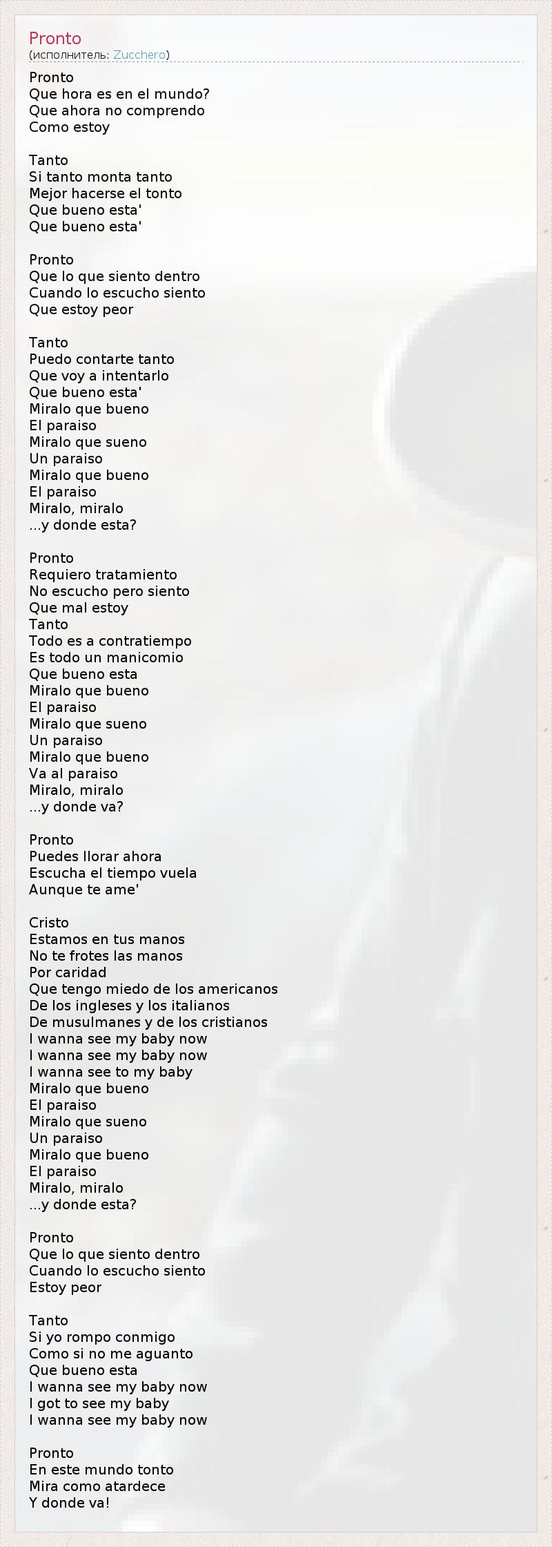 Это интересно:Zucchero (по-итальянски - сахарок) - итальянский рок-певец. Его настоящее имя - Adelmo Fornaciari. Родился 25 сентября 1955 года в итальянской провинции Reggio Emilia.Его наиболее известной в мире песней является, пожалуй, Senza Una Donna, которую он исполнил с Полом Янгом (Paul Young). Начав свою музыкальную карьеру в 1970 году, он выпустив первый сингл в 1976, а в 1983 - свой первый альбом. Его музыка, которую... продолжение