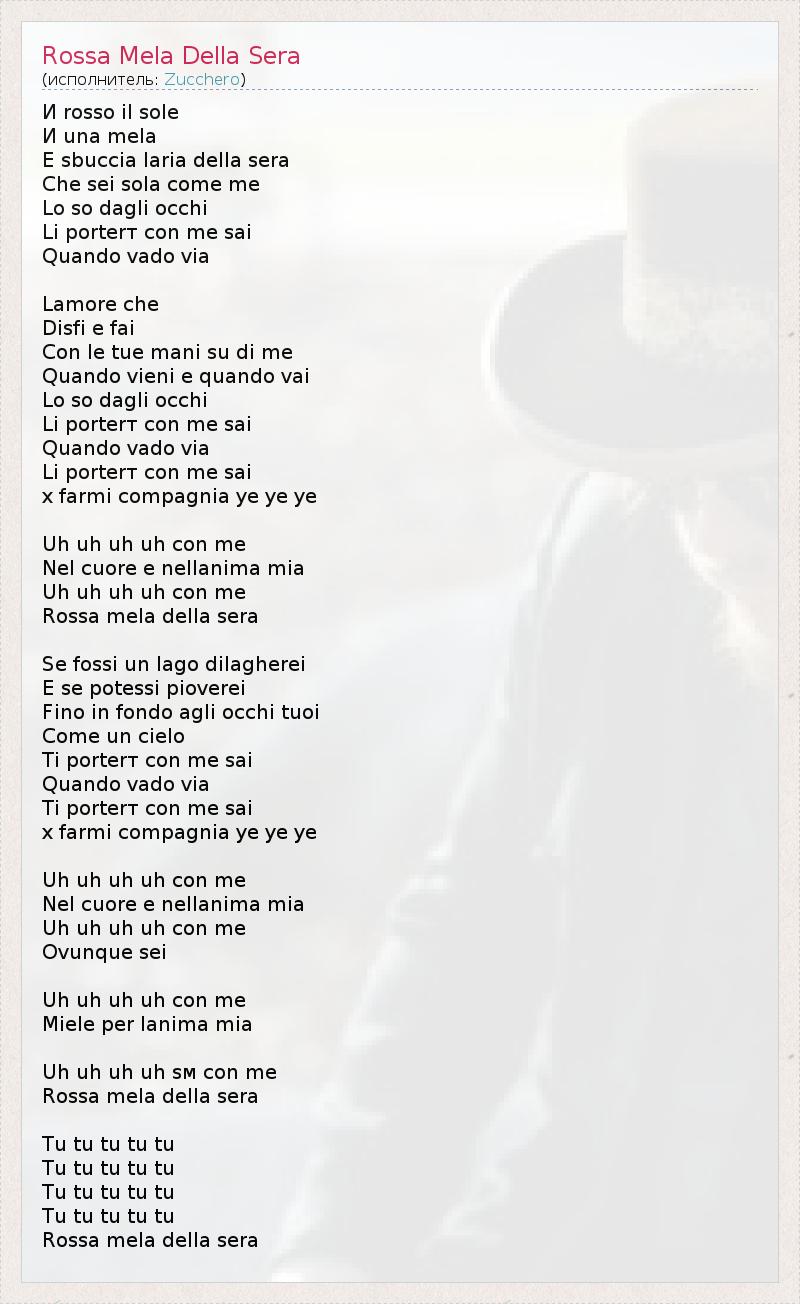 И rosso il sole И una mela E sbuccia laria della sera Che sei sola come me Lo so dagli occhi Li porterт con me sai Quando vado via Lamore che Disfi e fai Con le tue mani su di me Quando vieni e quando vai Lo so dagli occhi Li porterт con me sai Quando vado via Li porterт con me sai x farmi compagnia ye ye ye Uh uh uh uh con me Nel cuore e nellanima mia Uh uh uh uh con me Rossa mela della sera Se fossi un lago dilagherei E se potessi pioverei Fino in fondo agli occhi tuoi Come un cielo Ti porterт con me sai Quando vado via Ti porterт con me sai x farmi compagnia ye ye ye Uh uh uh uh con me Nel cuore e nellanima mia Uh uh uh uh con me Ovunque sei Uh uh uh uh con me Miele per lanima mia Uh uh uh uh sм con me Rossa mela della sera Tu tu tu tu tu Tu tu tu tu tu Tu tu tu tu tu Tu tu tu tu tu Rossa mela della sera