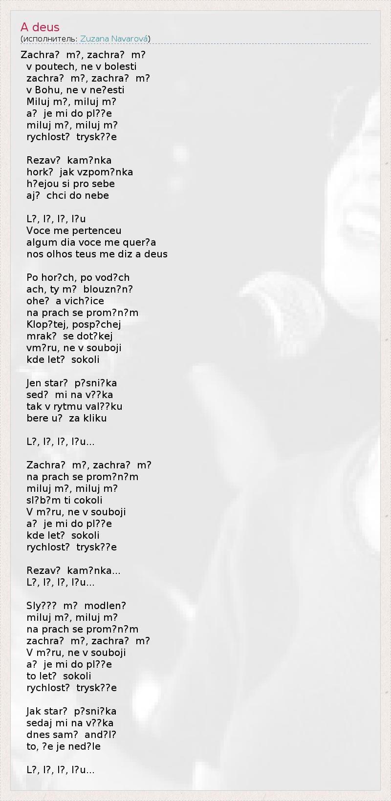 Это интересно:Во вторник утром после тяжелой болезни в возрасте 45 лет скончалась знаменитая чешская певица Зузана Наварова, одна из самых оригинальных личностей чешской музыкальной сцены. «Люди ее любили, потому что она отличалась от других», - сказал ее друг и коллега Зденек Вржештял.Идиш, цыганский, испанский, русский, словацкий и даже кечуанский языки звучат в песнях Зузаны Наваровой. - То, что... продолжение