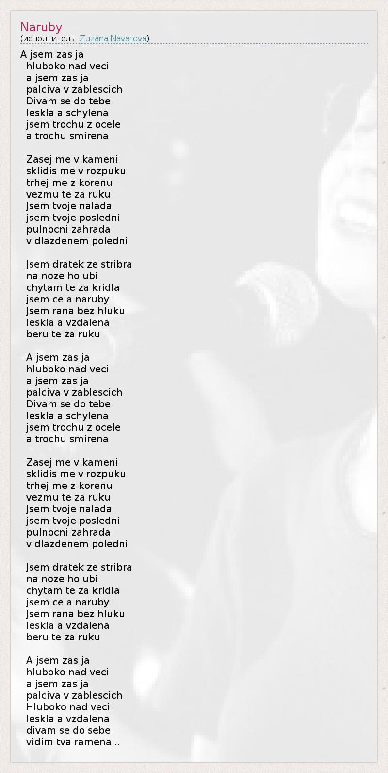 Это интересно:Во вторник утром после тяжелой болезни в возрасте 45 лет скончалась знаменитая чешская певица Зузана Наварова, одна из самых оригинальных личностей чешской музыкальной сцены. «Люди ее любили, потому что она отличалась от других», - сказал ее друг и коллега Зденек Вржештял.Идиш, цыганский, испанский, русский, словацкий и даже кечуанский языки звучат в песнях Зузаны Наваровой. - То, что... продолжение