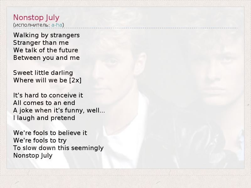 Walking by strangers Stranger than me We talk of the future Between you and me Sweet little darling Where will we be [2x] It's hard to conceive it All comes to an end A joke when it's funny, well... I laugh and pretend We're fools to believe it We're fools to try To slow down this seemingly Nonstop July