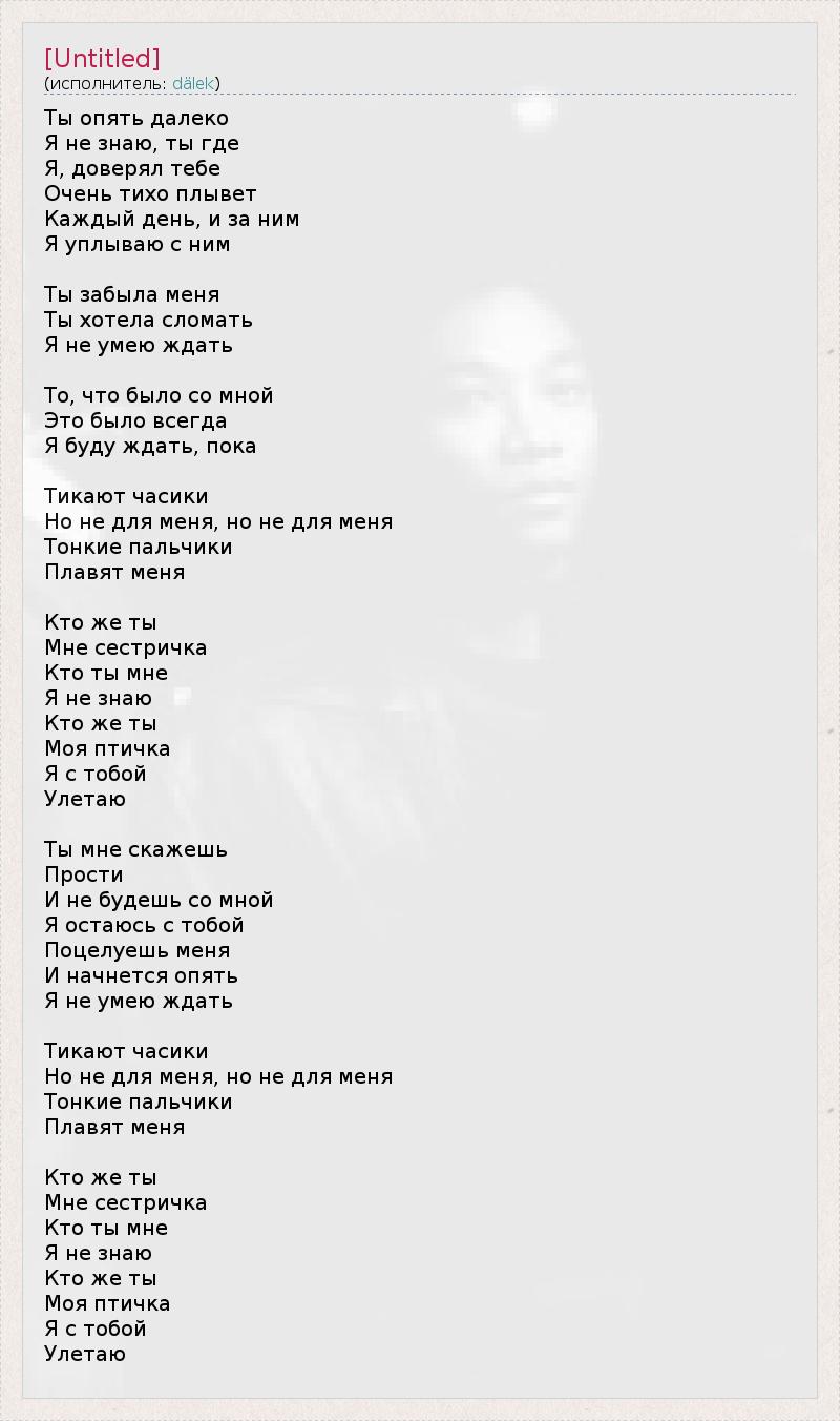 Ты опять далеко Я не знаю, ты где Я, доверял тебе Очень тихо плывет Каждый день, и за ним Я уплываю с ним Ты забыла меня Ты хотела сломать Я не умею ждать То, что было со мной Это было всегда Я буду ждать, пока Тикают часики Но не для меня, но не для меня Тонкие пальчики Плавят меня Кто же ты Мне сестричка Кто ты мне Я не знаю Кто же ты Моя птичка Я с тобой Улетаю Ты мне скажешь Прости И не будешь со мной Я остаюсь с тобой Поцелуешь меня И начнется опять Я не умею ждать Тикают часики Но не для меня, но не для меня Тонкие пальчики Плавят меня Кто же ты Мне сестричка Кто ты мне Я не знаю Кто же ты Моя птичка Я с тобой Улетаю