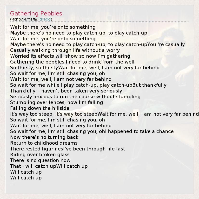 Wait for me, you're onto something Maybe there's no need to play catch-up, to play catch-up Wait for me, you're onto something Maybe there's no need to play catch-up, to play catch-upYou 're casually Casually walking through life without a worry Worried its effects will show so now I'm gathering Gathering the pebbles I need to drink from the well So thirsty, so thirstyWait for me, well, I am not very far behind So wait for me, I'm still chasing you, oh Wait for me, well, I am not very far behind So wait for me while I play catch-up, play catch-upBut thankfully Thankfully, I haven't been taken very seriously Seriously anxious to run the course without stumbling Stumbling over fences, now I'm falling Falling down the hillside It's way too steep, it's way too steepWait for me, well, I am not very far behind So wait for me, I'm still chasing you, oh Wait for me, well, I am not very far behind So wait for me, I'm still chasing you, ohI happened to take a chance Now there's no turning back Return to childhood dreams There rested figurinesI've been through life fast Riding over broken glass There is no question now That I will catch upWill catch up Will catch up Will catch up ...