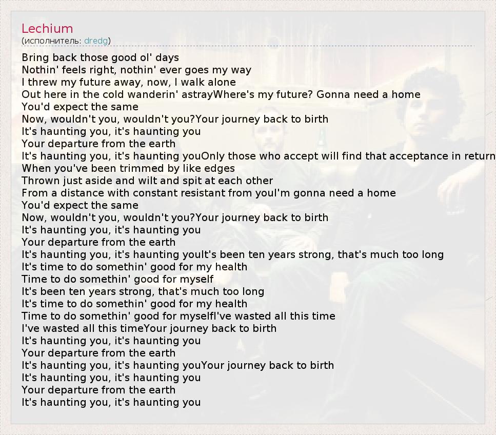 Bring back those good ol' days Nothin' feels right, nothin' ever goes my way I threw my future away, now, I walk alone Out here in the cold wanderin' astrayWhere's my future? Gonna need a home You'd expect the same Now, wouldn't you, wouldn't you?Your journey back to birth It's haunting you, it's haunting you Your departure from the earth It's haunting you, it's haunting youOnly those who accept will find that acceptance in return When you've been trimmed by like edges Thrown just aside and wilt and spit at each other From a distance with constant resistant from youI'm gonna need a home You'd expect the same Now, wouldn't you, wouldn't you?Your journey back to birth It's haunting you, it's haunting you Your departure from the earth It's haunting you, it's haunting youIt's been ten years strong, that's much too long It's time to do somethin' good for my health Time to do somethin' good for myself It's been ten years strong, that's much too long It's time to do somethin' good for my health Time to do somethin' good for myselfI've wasted all this time I've wasted all this timeYour journey back to birth It's haunting you, it's haunting you Your departure from the earth It's haunting you, it's haunting youYour journey back to birth It's haunting you, it's haunting you Your departure from the earth It's haunting you, it's haunting you