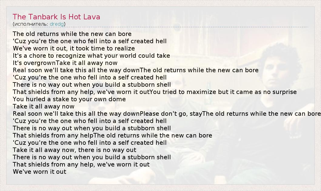 ГлавнаяИсполнителиdredgThe Tanbark Is Hot Lava