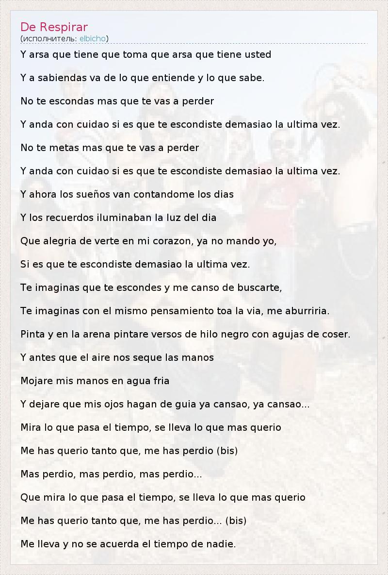 Y arsa que tiene que toma que arsa que tiene usted Y a sabiendas va de lo que entiende y lo que sabe. No te escondas mas que te vas a perder Y anda con cuidao si es que te escondiste demasiao la ultima vez. No te metas mas que te vas a perder Y anda con cuidao si es que te escondiste demasiao la ultima vez. Y ahora los sueños van contandome los dias Y los recuerdos iluminaban la luz del dia Que alegria de verte en mi corazon, ya no mando yo, Si es que te escondiste demasiao la ultima vez. Te imaginas que te escondes y me canso de buscarte, Te imaginas con el mismo pensamiento toa la via, me aburriria. Pinta y en la arena pintare versos de hilo negro con agujas de coser. Y antes que el aire nos seque las manos Mojare mis manos en agua fria Y dejare que mis ojos hagan de guia ya cansao, ya cansao... Mira lo que pasa el tiempo, se lleva lo que mas querio Me has querio tanto que, me has perdio (bis) Mas perdio, mas perdio, mas perdio... Que mira lo que pasa el tiempo, se lleva lo que mas querio Me has querio tanto que, me has perdio... (bis) Me lleva y no se acuerda el tiempo de nadie.