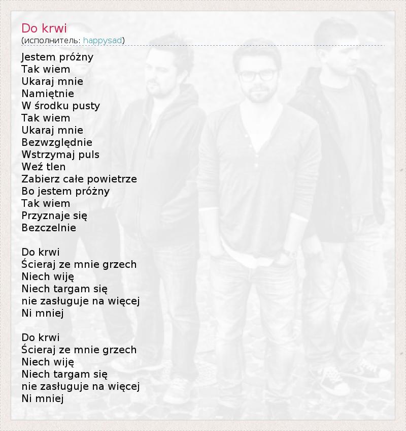Jestem próżny Так WIEM Ukaraj mnie Namiętnie W środku pusty Так WIEM Ukaraj mnie Bezwzględnie Wstrzymaj Пульс WEZ Tlen Zabierz Кейл powietrze Бо Jestem próżny Так WIEM Przyznaje się Bezczelnie У krwi Ścieraj ZE mnie grzech Niech wiję Niech targam się Nie zasługuje на więcej Ni mniej У krwi Ścieraj ZE mnie grzech Niech wiję Niech targam się Nie zasługuje на więcej Ni mniej
