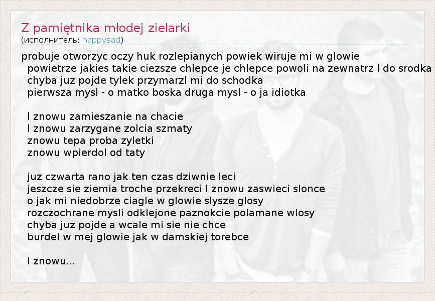 Это интересно:happysad, до 2001 HCKF образовались в городе Skarżysko-Kamienna, Польша. Члены группы были знакомы с 1994, но они решились создать “happysad” лишь в конце 2001. В июле 2004 happysad дебютировал с компакт-диском „Wszystko Jedno”, который был издан SP Records.Музыка happysad главным образом состоит из мелодичного рока, с элементами панка и регги, с характерной лирикой. В одном 2004 группа дала больше 150 концертов, включая поддержку... продолжение