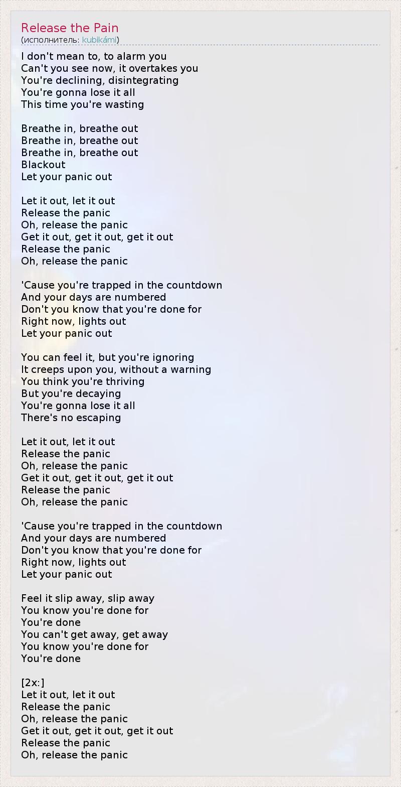 I don't mean to, to alarm you Can't you see now, it overtakes you You're declining, disintegrating You're gonna lose it all This time you're wasting Breathe in, breathe out Breathe in, breathe out Breathe in, breathe out Blackout Let your panic out Let it out, let it out Release the panic Oh, release the panic Get it out, get it out, get it out Release the panic Oh, release the panic 'Cause you're trapped in the countdown And your days are numbered Don't you know that you're done for Right now, lights out Let your panic out You can feel it, but you're ignoring It creeps upon you, without a warning You think you're thriving But you're decaying You're gonna lose it all There's no escaping Let it out, let it out Release the panic Oh, release the panic Get it out, get it out, get it out Release the panic Oh, release the panic 'Cause you're trapped in the countdown And your days are numbered Don't you know that you're done for Right now, lights out Let your panic out Feel it slip away, slip away You know you're done for You're done You can't get away, get away You know you're done for You're done [2x:] Let it out, let it out Release the panic Oh, release the panic Get it out, get it out, get it out Release the panic Oh, release the panic