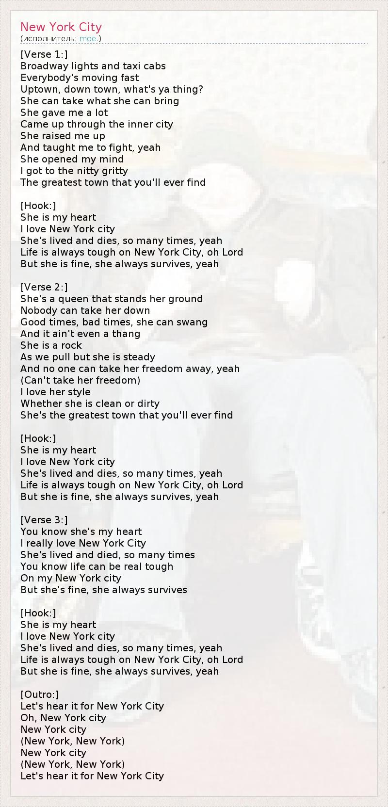 [1 куплет:] Огни Бродвея и такси, Все спешат. На окраину? В центр? Куда вам? Он 1 может отобрать то, что подарил, Но он дал мне много. Он вышел из гетто И воскресил меня, Он научил меня бороться. Он раскрыл мою душу, Я вернулся к основам, В величайший город из всех. [Хук:] Он – мое сердце. Я люблю Нью-Йорк. Он умирал и оживал так много раз. Жить в Нью-Йорке всегда нелегко, о, Боже! Но он прекрасен, он всё переживёт. Да! [2 куплет:] Он – король, который не теряет свою корону. Никто не может его сломить. Хорошие времена или плохие – он рулит! Ему всё нипочём, Он – скала. Мы пытаемся его сдвинуть, а он остается на месте. И никто не отнимет у него его свободу! Да! (Не отнимет у него свободу) Я люблю его стиль, Будь он чистый или грязный. Это величайший город из всех. [Хук:] Он – мое сердце. Я люблю Нью-Йорк. Он умирал и оживал так много раз. Жить в Нью-Йорке всегда нелегко, о, Боже! Но он прекрасен, он всё переживёт. Да! [3 куплет:] Знаете, он – моё сердце. Я очень люблю Нью-Йорк. Он умирал и оживал так много раз. Знаете, жизнь бывает ох как нелегка В моем Нью-Йорке, Но он прекрасен, он всё переживёт. Да! [Хук:] Он – мое сердце. Я люблю Нью-Йорк. Он умирал и оживал так много раз. Жить в Нью-Йорке всегда нелегко, о, Боже! Но он прекрасен, он всё переживёт. Да! [Окончание:] Поаплодируем Нью-Йорку! О, Нью-Йорк, Нью-Йорк, (Нью-Йорк, Нью-Йорк) Нью-Йорк, (Нью-Йорк, Нью-Йорк) Поприветствуем Нью-Йорк! 1 – В оригинале: she – "она". "Она" в данном контексте – это город Нью-Йорк (слово "город" во многих европейских языках (например, во французском, немецком, итальянском, испанском) относится к женскому роду).