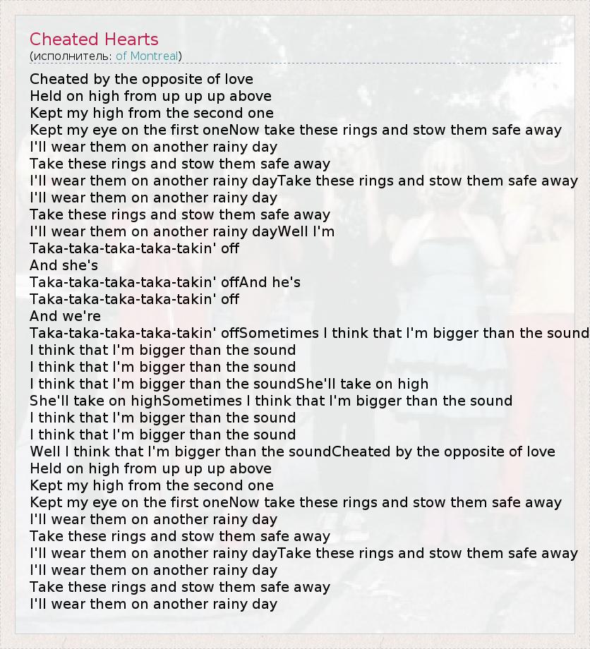 А как ты думаешь, о чем песня "Cheated Hearts" ?