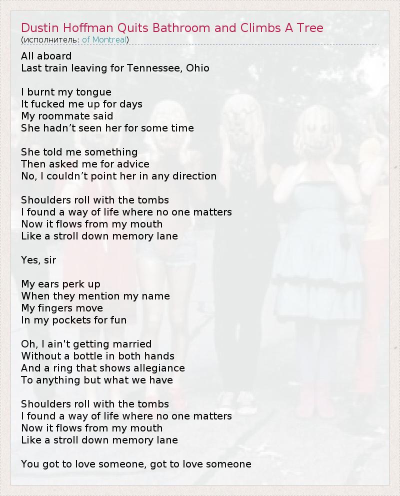 ГлавнаяИсполнителиof MontrealDustin Hoffman Quits Bathroom and Climbs A Tree