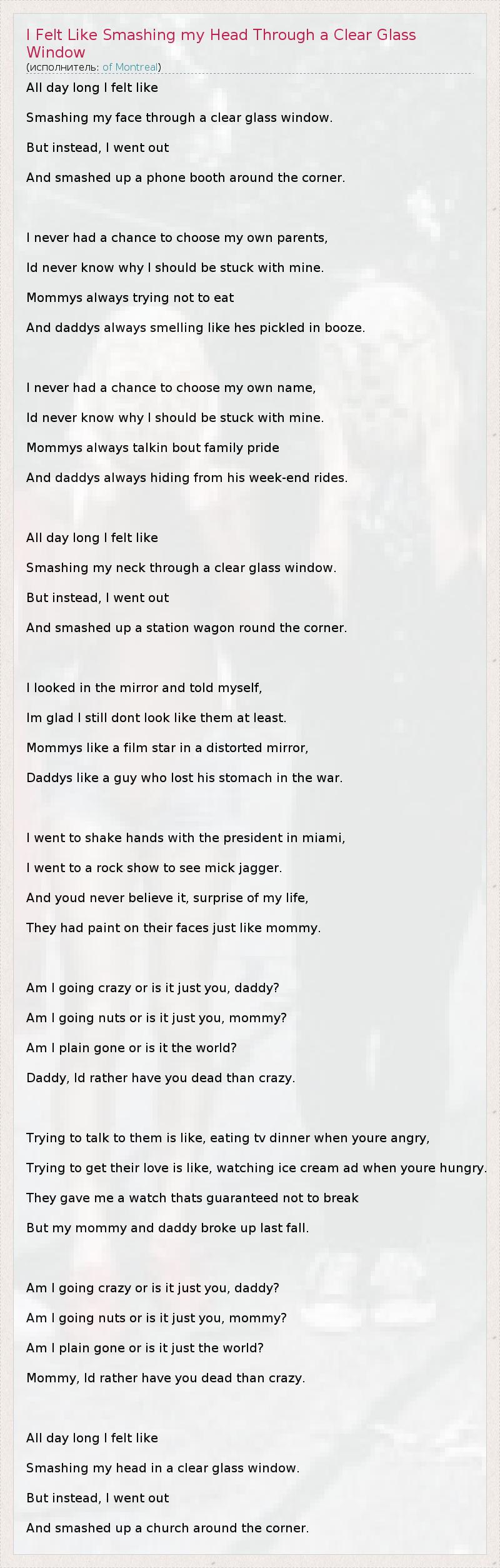 А как ты думаешь, о чем песня "I Felt Like Smashing my Head Through a Clear Glass Window" ?