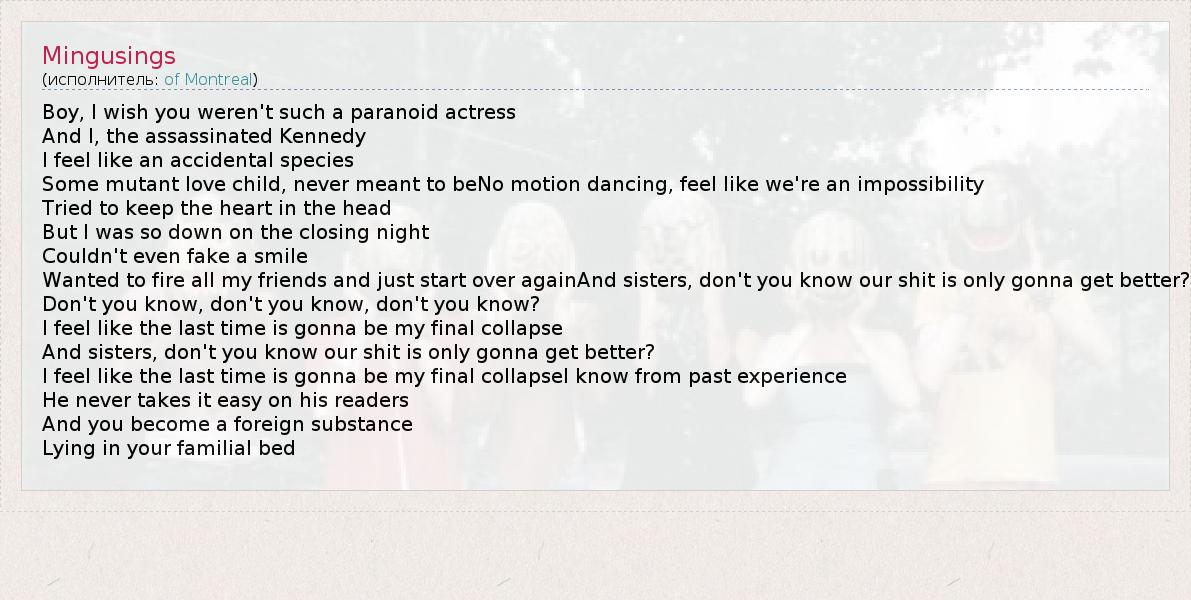 Wanted to fire all my friends and just start over againAnd sisters, don't you know our shit is only gonna get better?