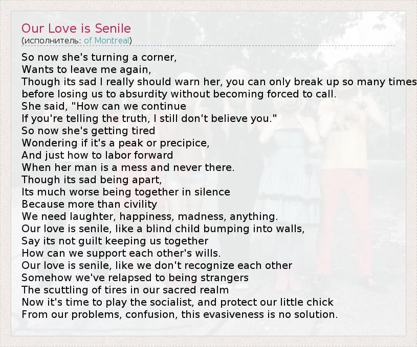 А как ты думаешь, о чем песня "Our Love is Senile" ?