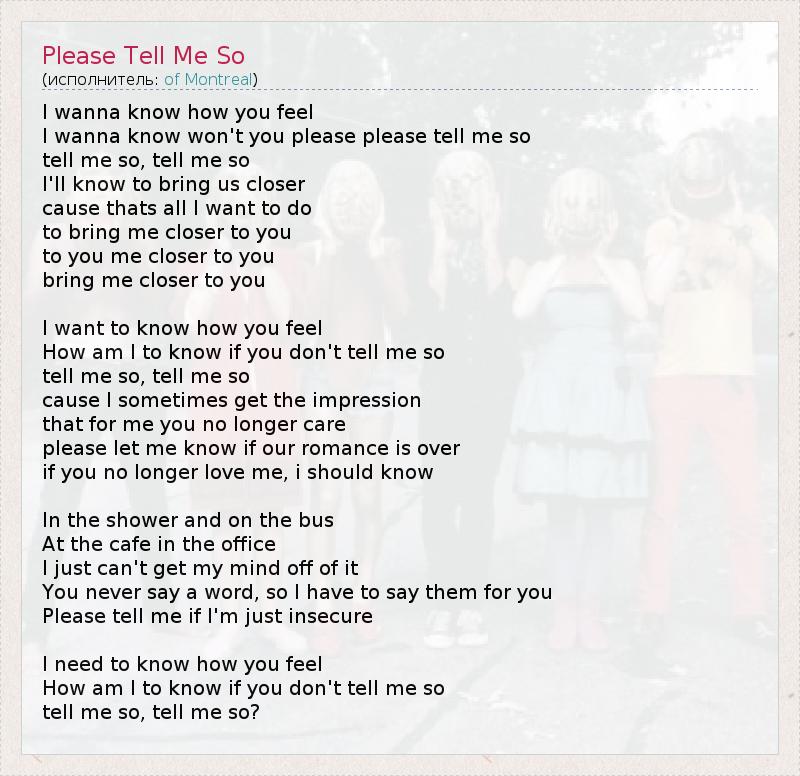 I wanna know how you feel I wanna know won't you please please tell me so tell me so, tell me so I'll know to bring us closer cause thats all I want to do to bring me closer to you to you me closer to you bring me closer to you I want to know how you feel How am I to know if you don't tell me so tell me so, tell me so cause I sometimes get the impression that for me you no longer care please let me know if our romance is over if you no longer love me, i should know In the shower and on the bus At the cafe in the office I just can't get my mind off of it You never say a word, so I have to say them for you Please tell me if I'm just insecure I need to know how you feel How am I to know if you don't tell me so tell me so, tell me so?