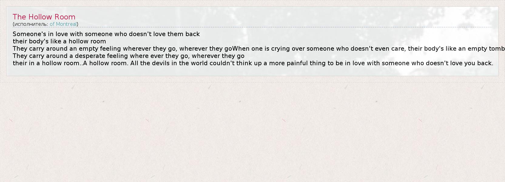 Someone's in love with someone who doesn't love them back their body's like a hollow room They carry around an empty feeling wherever they go, wherever they goWhen one is crying over someone who doesn't even care, their body's like an empty tomb They carry around a desperate feeling where ever they go, wherever they go their in a hollow room..A hollow room. All the devils in the world couldn't think up a more painful thing to be in love with someone who doesn't love you back.