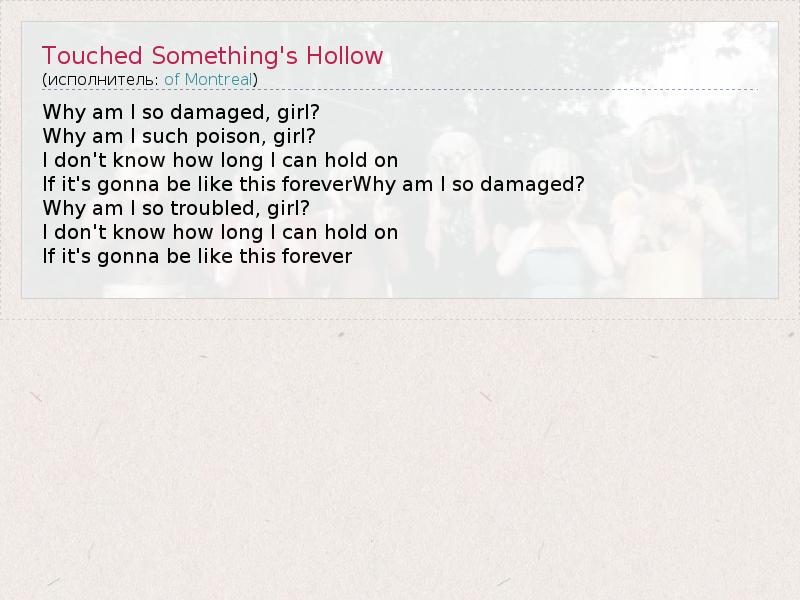 А как ты думаешь, о чем песня "Touched Something's Hollow" ?