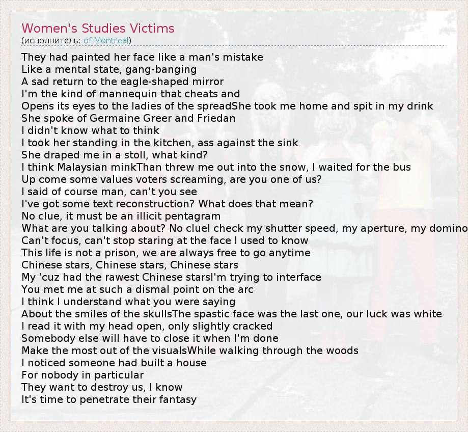 А как ты думаешь, о чем песня "Women's Studies Victims" ?