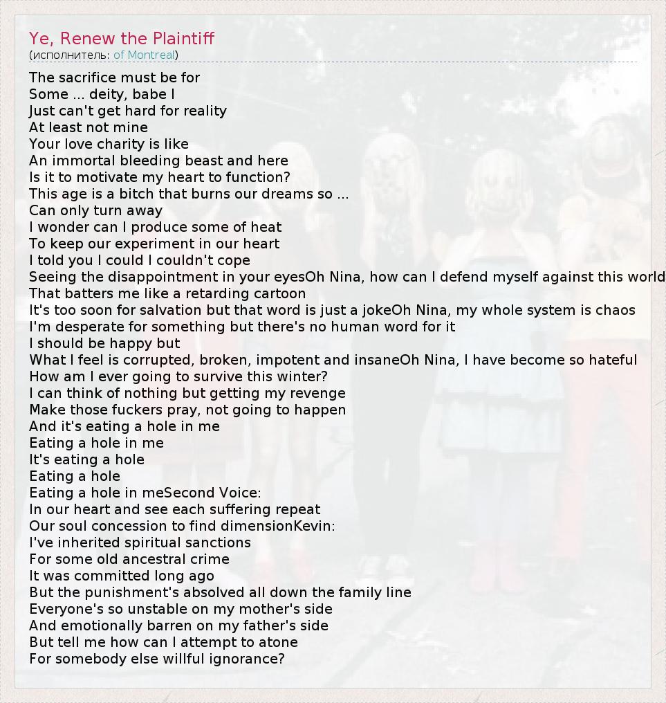 А как ты думаешь, о чем песня "Ye, Renew the Plaintiff" ?