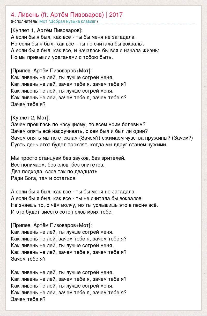[Куплет 1, Артём Пивоваров]: А если бы я был, как все - ты бы меня не загадала. Но если бы я был, как все - ты не считала бы вокзалы. А если бы я был, как все, и началась бы вся с начала жизнь; Но мы привыкли ураганами с тобою быть. [Припев, Артём Пивоваров+Мот]: Как ливень не лей, ты лучше согрей меня. Как ливень не лей, зачем тебе я, зачем тебе я? Как ливень не лей, ты лучше согрей меня. Как ливень не лей, зачем тебе я, зачем тебе я? Зачем тебе я? [Куплет 2, Мот]: Зачем прошлась по насущному, по всем моим болевым? Зачем опять всё накручивать, с кем был и был ли один? Зачем опять мы по стеклам (Зачем?) сжимаем чувства пружины? (Зачем?) Пусть день этот будет проклят, когда мы вдруг станем чужими. Мы просто станцуем без звуков, без зрителей. Всё понимаем, без слов, без эпитетов. Два подхода, слов так по двадцать Ради Бога, там и остаться. А если бы я был, как все - ты бы меня не загадала. А если бы я был, как все - ты не считала бы вокзалов. Не знаешь то, о чём молчу, но ты услышишь это в песне всё. И это будет вместо сотен слов моих тебе. [Припев, Артём Пивоваров+Мот]: Как ливень не лей, ты лучше согрей меня. Как ливень не лей, зачем тебе я, зачем тебе я? Как ливень не лей, ты лучше согрей меня. Как ливень не лей, зачем тебе я, зачем тебе я? Зачем тебе я? Как ливень не лей, ты лучше согрей меня. Как ливень не лей, зачем тебе я, зачем тебе я? Как ливень не лей, ты лучше согрей меня. Как ливень не лей, зачем тебе я, зачем тебе я? Зачем тебе я?