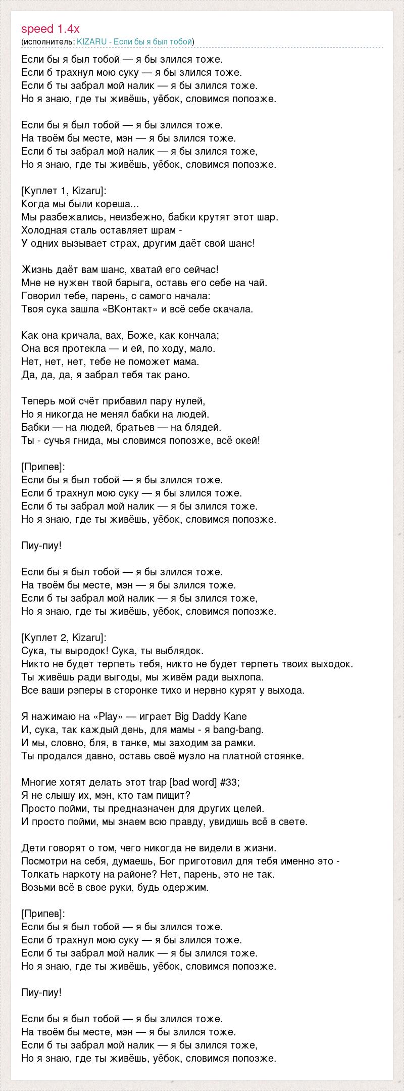 Если бы я был тобой — я бы злился тоже. Если б трахнул мою суку — я бы злился тоже. Если б ты забрал мой налик — я бы злился тоже. Но я знаю, где ты живёшь, уёбок, словимся попозже. Если бы я был тобой — я бы злился тоже. На твоём бы месте, мэн — я бы злился тоже. Если б ты забрал мой налик — я бы злился тоже, Но я знаю, где ты живёшь, уёбок, словимся попозже. [Куплет 1, Kizaru]: Когда мы были кореша... Мы разбежались, неизбежно, бабки крутят этот шар. Холодная сталь оставляет шрам - У одних вызывает страх, другим даёт свой шанс! Жизнь даёт вам шанс, хватай его сейчас! Мне не нужен твой барыга, оставь его себе на чай. Говорил тебе, парень, с самого начала: Твоя сука зашла «ВКонтакт» и всё себе скачала. Как она кричала, вах, Боже, как кончала; Она вся протекла — и ей, по ходу, мало. Нет, нет, нет, тебе не поможет мама. Да, да, да, я забрал тебя так рано. Теперь мой счёт прибавил пару нулей, Но я никогда не менял бабки на людей. Бабки — на людей, братьев — на блядей. Ты - сучья гнида, мы словимся попозже, всё окей! [Припев]: Если бы я был тобой — я бы злился тоже. Если б трахнул мою суку — я бы злился тоже. Если б ты забрал мой налик — я бы злился тоже. Но я знаю, где ты живёшь, уёбок, словимся попозже. Пиу-пиу! Если бы я был тобой — я бы злился тоже. На твоём бы месте, мэн — я бы злился тоже. Если б ты забрал мой налик — я бы злился тоже, Но я знаю, где ты живёшь, уёбок, словимся попозже. [Куплет 2, Kizaru]: Сука, ты выродок! Сука, ты выблядок. Никто не будет терпеть тебя, никто не будет терпеть твоих выходок. Ты живёшь ради выгоды, мы живём ради выхлопа. Все ваши рэперы в сторонке тихо и нервно курят у выхода. Я нажимаю на «Play» — играет Big Daddy Kane И, сука, так каждый день, для мамы - я bang-bang. И мы, словно, бля, в танке, мы заходим за рамки. Ты продался давно, оставь своё музло на платной стоянке. Многие хотят делать этот trap [bad word] #33; Я не слышу их, мэн, кто там пищит? Просто пойми, ты предназначен для других целей. И просто пойми, мы знаем всю правду, увидишь всё в свете. Дети говорят о том, чего никогда не видели в жизни. Посмотри на себя, думаешь, Бог приготовил для тебя именно это - Толкать наркоту на районе? Нет, парень, это не так. Возьми всё в свое руки, будь одержим. [Припев]: Если бы я был тобой — я бы злился тоже. Если б трахнул мою суку — я бы злился тоже. Если б ты забрал мой налик — я бы злился тоже. Но я знаю, где ты живёшь, уёбок, словимся попозже. Пиу-пиу! Если бы я был тобой — я бы злился тоже. На твоём бы месте, мэн — я бы злился тоже. Если б ты забрал мой налик — я бы злился тоже, Но я знаю, где ты живёшь, уёбок, словимся попозже.