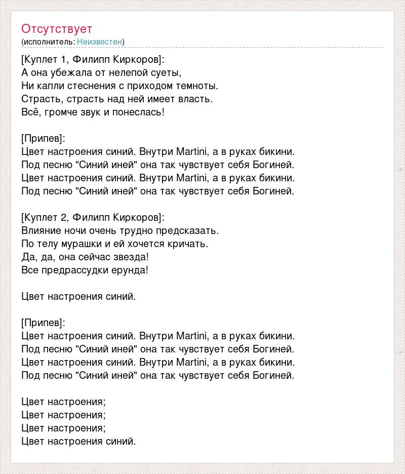 [Куплет 1, Филипп Киркоров]: А она убежала от нелепой суеты, Ни капли стеснения с приходом темноты. Страсть, страсть над ней имеет власть. Всё, громче звук и понеслась! [Припев]: Цвет настроения синий. Внутри Martini, а в руках бикини. Под песню "Синий иней" она так чувствует себя Богиней. Цвет настроения синий. Внутри Martini, а в руках бикини. Под песню "Синий иней" она так чувствует себя Богиней. [Куплет 2, Филипп Киркоров]: Влияние ночи очень трудно предсказать. По телу мурашки и ей хочется кричать. Да, да, она сейчас звезда! Все предрассудки ерунда! Цвет настроения синий. [Припев]: Цвет настроения синий. Внутри Martini, а в руках бикини. Под песню "Синий иней" она так чувствует себя Богиней. Цвет настроения синий. Внутри Martini, а в руках бикини. Под песню "Синий иней" она так чувствует себя Богиней. Цвет настроения; Цвет настроения; Цвет настроения; Цвет настроения синий.