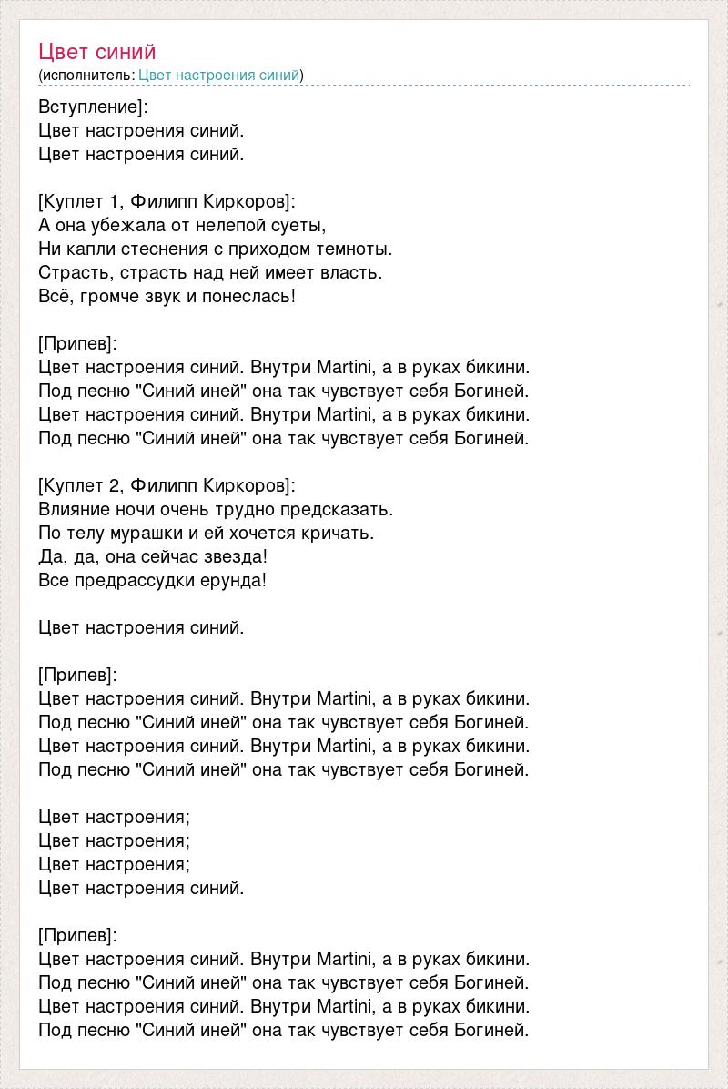Вступление]: Цвет настроения синий. Цвет настроения синий. [Куплет 1, Филипп Киркоров]: А она убежала от нелепой суеты, Ни капли стеснения с приходом темноты. Страсть, страсть над ней имеет власть. Всё, громче звук и понеслась! [Припев]: Цвет настроения синий. Внутри Martini, а в руках бикини. Под песню "Синий иней" она так чувствует себя Богиней. Цвет настроения синий. Внутри Martini, а в руках бикини. Под песню "Синий иней" она так чувствует себя Богиней. [Куплет 2, Филипп Киркоров]: Влияние ночи очень трудно предсказать. По телу мурашки и ей хочется кричать. Да, да, она сейчас звезда! Все предрассудки ерунда! Цвет настроения синий. [Припев]: Цвет настроения синий. Внутри Martini, а в руках бикини. Под песню "Синий иней" она так чувствует себя Богиней. Цвет настроения синий. Внутри Martini, а в руках бикини. Под песню "Синий иней" она так чувствует себя Богиней. Цвет настроения; Цвет настроения; Цвет настроения; Цвет настроения синий. [Припев]: Цвет настроения синий. Внутри Martini, а в руках бикини. Под песню "Синий иней" она так чувствует себя Богиней. Цвет настроения синий. Внутри Martini, а в руках бикини. Под песню "Синий иней" она так чувствует себя Богиней.